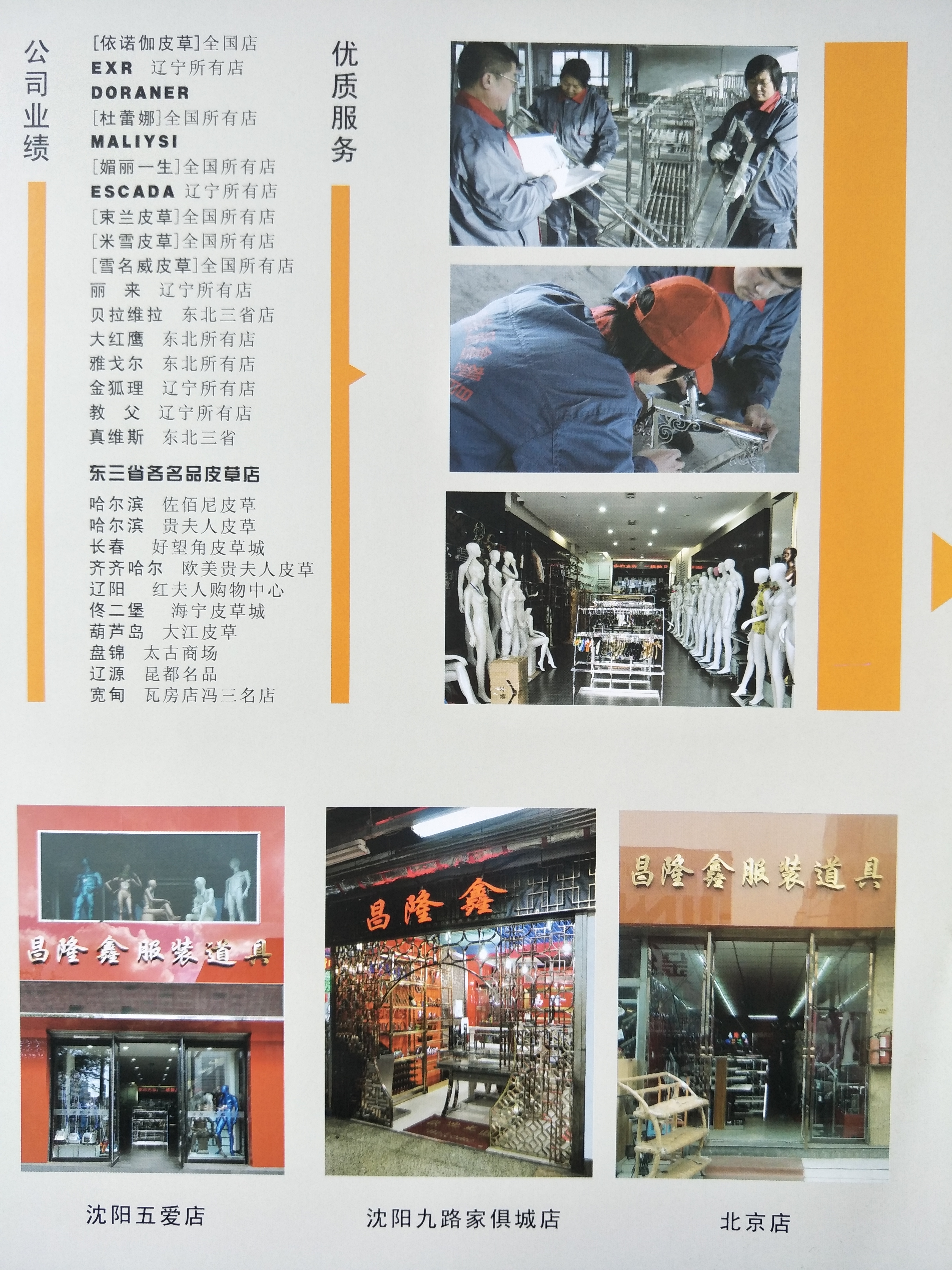沈阳昌隆鑫不锈钢商展道具有限公司,创建于2003年3月,是集设计、生产、销售为一体的生产商业形象展示、不锈钢展示挂件及服装模特的专业厂家。公司以“立足沈阳、辐射全国,争创商展道具优质品牌”为已任,坚持品质为本、诚信第一,顾客至上、双赢共享的企业理念,经过多年脚踏实地的经营发展、创新开放的企业管理,在敬业专注的职业销售团队的积极推动下,先后在东北沈阳九路、五爱、北京等地建立产品直营店,经销代理商网络覆盖延伸至华中、华北、西北、东北等区域一线城市,赢得了顾客群体的高度信赖和热情赞誉。