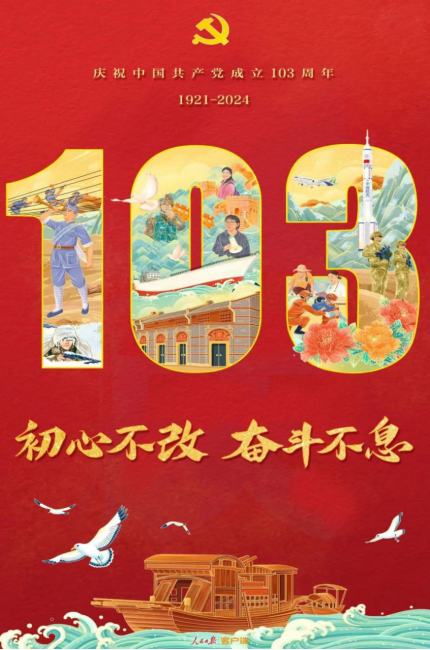 今天,我们迎来中国共产党成立103周年,正在中国式现代化道路上踔厉奋发、勇毅前行。走过峥嵘岁月,历经风雨洗礼,百年大党风华正茂;永葆赤子之心,砥砺复兴之志,千秋伟业气势如虹。