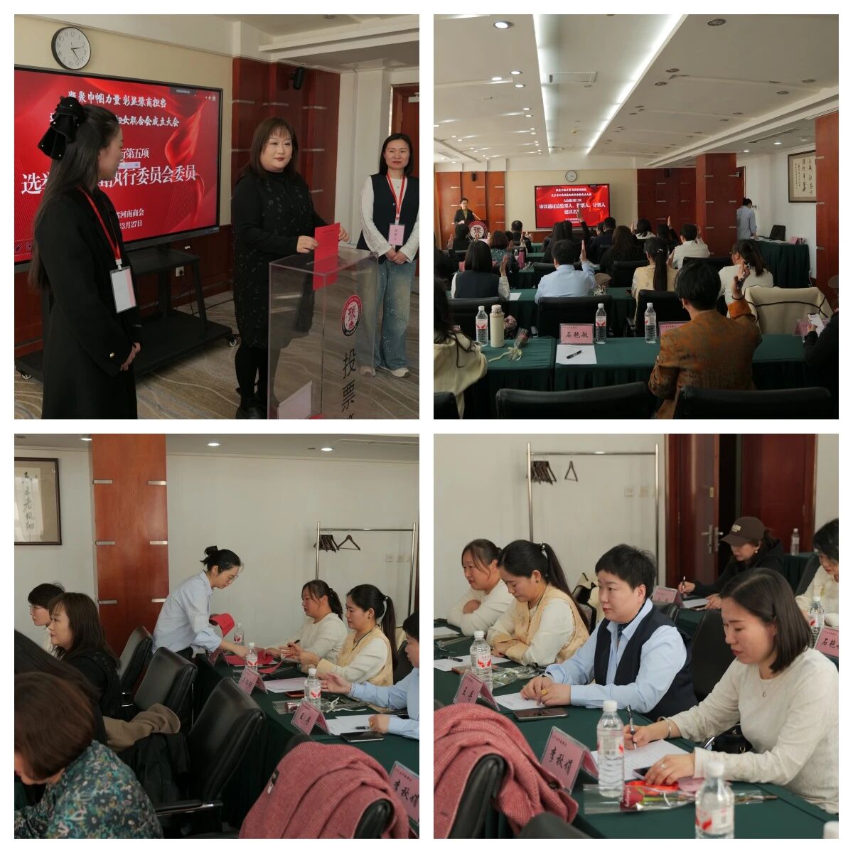 大会在庄严的国歌声中拉开帷幕。全体代表听取大会筹备工作报告、审议通过大会选举办法(草案)、审议通过总监票人、监票人、计票人建议名单及听取第一届执委候选人情况说明,并以无记名投票方式,差额选举产生了辽宁省河南商会妇联第一届执行委员会委员:王芳、冯慧玲、刘红艳、刘社香、朱晓静、吴向向、张军芳、夏东敏、郭仁赫九位同志光荣当选。