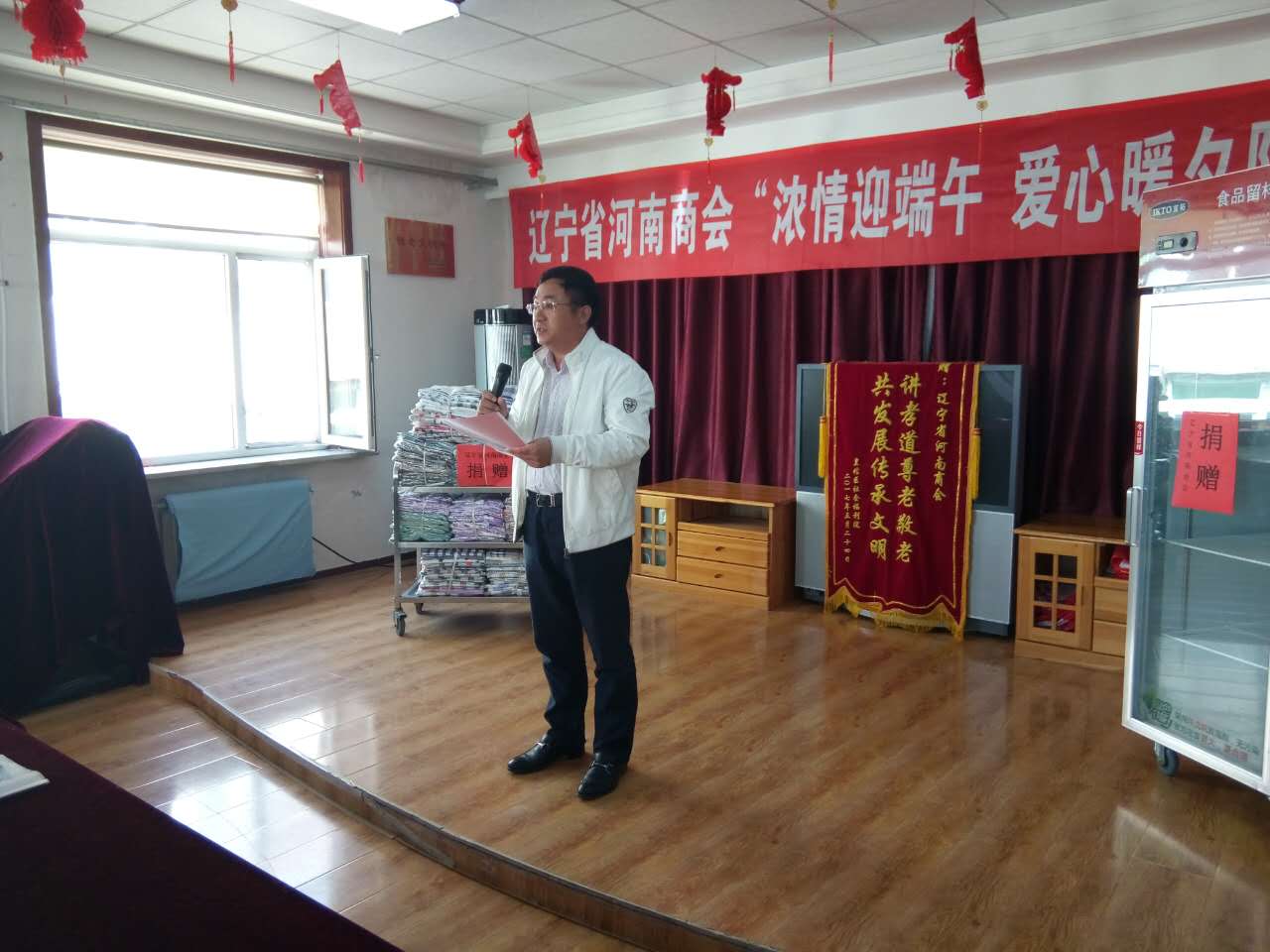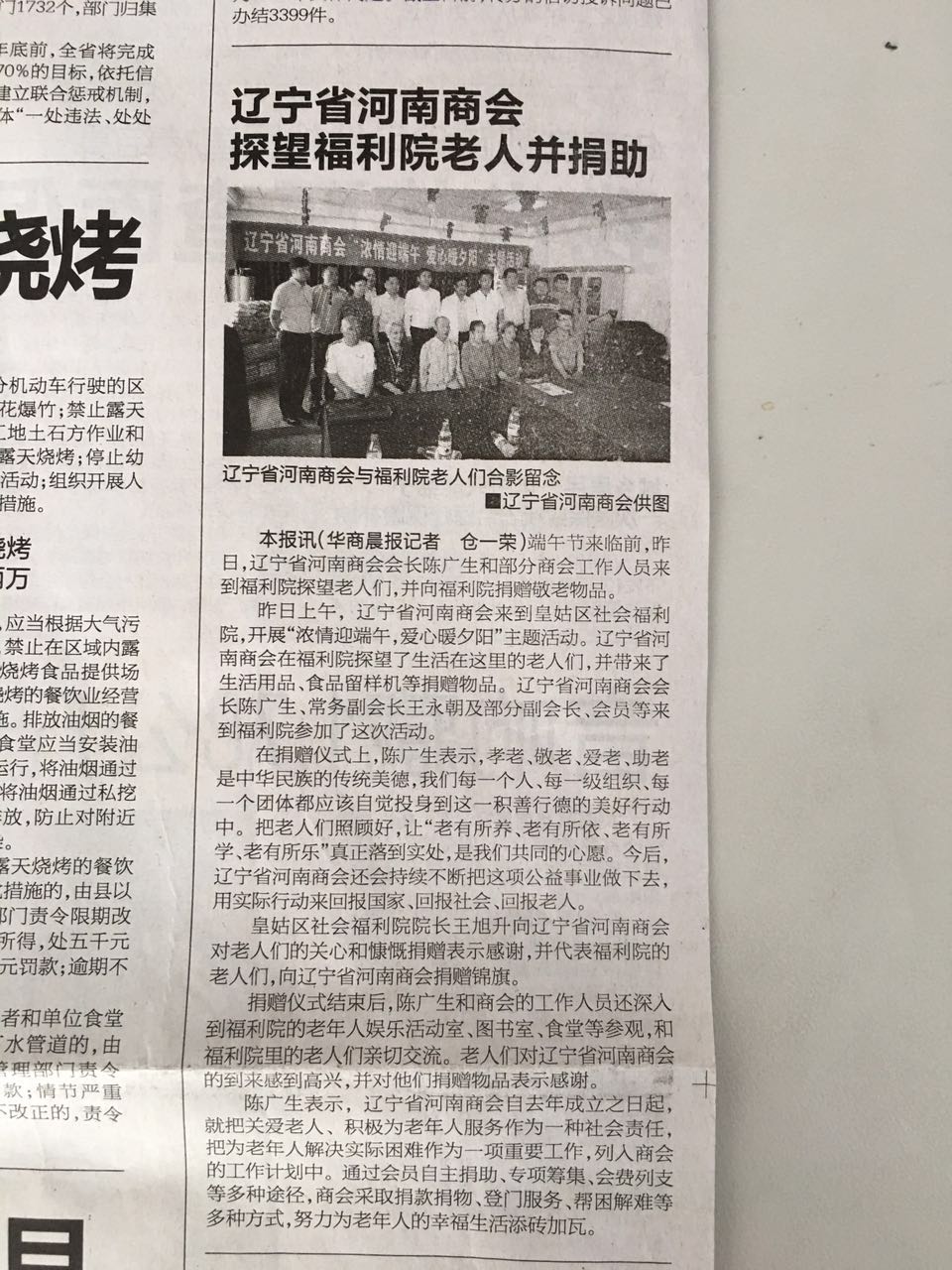5月24日,在端午节即将来临之际,商会会长陈广生、常务副会长王永朝、副秘书长兼办公室主任许戈,及副会长付高增、杨耀文、赵新红等一行10余人,代表辽宁省河南商会专程到沈阳市皇姑区福利院看望慰问老人,带去了食品留样柜、150个床单等生活用品。